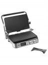 Электрогриль DeLonghi CGH1012D – многофункциональное устройство, которое работает в трех режимах в зависимости от положения крышки. Она может быть закрыта, развернута на 180 градусов или приподнята над жарочной поверхностью. Это позволит жарить стейки и рыбу, бекон и морепродукты, готовить открытые бутерброды и другие блюда, которые нельзя сминать. В комплекте – рифленая и гладкая пластины с антипригарным покрытием. Управление производится при помощи поворотных регуляторов, отвечающих за выбор уровня нагрева в диапазоне от 60 до 230 градусов. Для каждой поверхности можно выставить свои параметры работы – это позволит одновременно жарить разные продукты, например, мясо и овощи. Процесс нагрева сопровождается световой индикация, а о готовности к работе оповещает звуковой сигнал. Настройки отображает встроенный дисплей. Есть таймер, с помощью которого программируется продолжительность приготовления. После истечения заданного времени электрогриль отключается автоматически. Полезен режим Sear: при его активации прибор быстро разогревается до высокой температуры и поддерживает ее несколько минут. Это удобно для жарки толстых кусков мяса: на них образуется румяная корочка, а внутри сохранится сочность. Режим можно включить раз в 30 минут. Все схемные элементы электрогриля можно мыть в посудомоечной машине.
